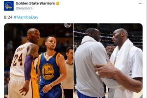 勇士官推曬出了庫里和科比、追夢和科比的合照,紀(jì)念曼巴日,并寫道:“8.24#曼巴日。”