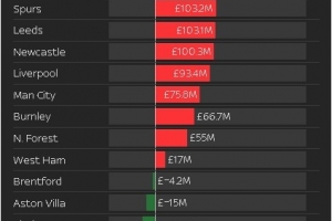 2025年夏季英超俱樂(lè)部轉(zhuǎn)會(huì)凈支出榜