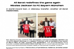 “Epic Sports自豪地宣布,塞內(nèi)加爾國(guó)腳尼古拉斯-杰克遜已加盟拜仁慕尼黑,形式為為期一年的租借,附帶強(qiáng)制買(mǎi)斷條款,總價(jià)為8150萬(wàn)歐元(協(xié)議包含5年合同預(yù)簽)?!?/p>