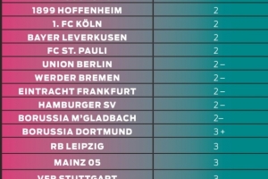 2分:奧格斯堡、霍芬海姆、科隆、勒沃庫(kù)森、圣保利