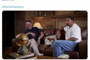 歐文接受費(fèi)迪南德的采訪,并展示自己獲得的2001年金球獎(jiǎng)杯,費(fèi)迪南德社媒曬出視頻,配文:“金球、金球、金球、金球?!?/p>