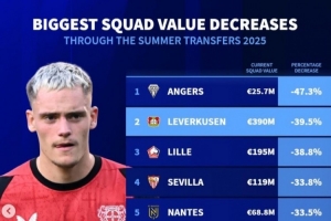 體育資訊9月7日訊 《轉(zhuǎn)會市場》統(tǒng)計了今夏轉(zhuǎn)會窗過后的總身價下降比例情況,昂熱居首,法甲7隊在列。