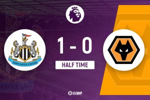 上半場比賽結(jié)束,紐卡斯?fàn)柭?lián)1-0狼隊(duì)。