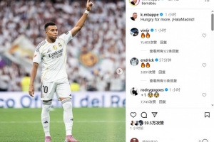姆巴佩本場比賽打入一球,他寫道:“渴望更多,Hala Madrid!”