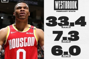 接著NBA Memes曬出了2020年2月搭伙哈登時的威少的月數(shù)據(jù),場均33.4分7.3板6助攻,投籃命中率為54.9%。