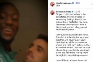 迪奧戈(若塔)……我還是沒法相信。我心都碎了,真的不知道該怎么表達此刻的感受。你不僅是一位非凡的球員,更是一位難得的摯友、兄弟!愿你和安德烈安息。
