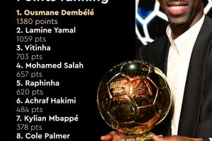 體育資訊09月27日訊 金球獎(jiǎng)分?jǐn)?shù)公布:登貝萊1380分第一,亞馬爾1059分。