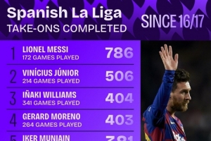 體育資訊10月10日訊 Squawka統(tǒng)計了2016-2017賽季以來球員在西甲的成功過人次數(shù),并列出榜單,梅西786次居首,維尼修斯506次第二。