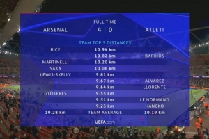 賽后兩隊跑動數(shù)據(jù)顯示,阿森納全隊平均跑動距離為10.28KM略高于馬競的10.19KM。但是,在跑動距離超過10KM的球員中,阿森納有3人,分別為賴斯(全場最高10.94KM)、馬丁內(nèi)利和薩卡,而馬競僅有1人為巴里奧斯。