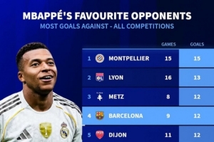 體育資訊10月27日訊 皇馬在本輪西甲焦點(diǎn)戰(zhàn)2-1力克巴薩,姆巴佩取得進(jìn)球。《轉(zhuǎn)會市場》統(tǒng)計顯示,巴薩也是姆巴佩生涯各項(xiàng)賽事進(jìn)球第4多的對手。