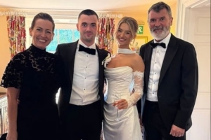 體育資訊10月30日訊 據(jù)《太陽報》報道,曼聯(lián)傳奇羅伊-基恩的兒子艾丹上周末舉行了婚禮?;髟谏缑椒窒砹艘粡埣彝ズ嫌?,照片中他身穿燕尾服與妻子特蕾莎和新婚夫婦站在一起。