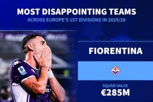體育資訊11月7日訊 德國轉(zhuǎn)會市場根據(jù)球隊的身價和目前的排名,列出了本賽季歐洲頂級聯(lián)賽最令人失望球隊,佛羅倫薩、紐卡、畢爾巴鄂競技在列。