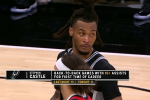 目前,二年級新秀卡斯爾已經(jīng)得到12分2籃板11助攻2搶斷;據(jù)統(tǒng)計,卡斯爾連續(xù)兩場比賽助攻上雙,個人職業(yè)生涯首次。