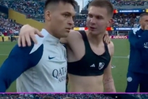 賽后,國米的阿根廷前鋒勞塔羅主動找到河床小將馬斯坦托諾安慰,兩人搭肩并且擁抱致意。