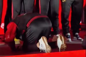 體育資訊11月10日訊 今日重慶銅梁龍進行了沖超慶典,在晚會上,賽季中途接手球隊的主帥張外龍感謝了球員們的努力,并向隊員們行大禮致謝。