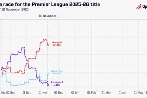 Opta曬英超本賽季截至目前的爭(zhēng)冠概率走勢(shì):利物浦從賽季初被看好跌到目前的7%,阿森納目前63.6%,曼城目前22.9%