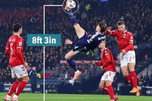 據(jù)太陽報統(tǒng)計,麥克托米奈倒鉤時腳部高度達到了8英尺3英寸(約2.53米),比C羅在皇馬時對陣尤文的倒鉤高度(7英尺7英寸,約2.38米)還要高。