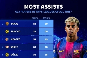五大聯(lián)賽歷史U19球員助攻排名(19歲之前助攻):