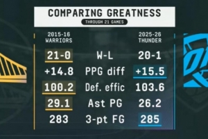 15-16賽季勇士以21勝0負不敗戰(zhàn)績開局,本賽季的雷霆以20勝1負緊追其后。
