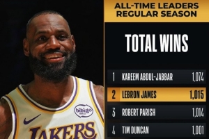 據(jù)NBA官方統(tǒng)計,這是詹姆斯生涯第1015場常規(guī)賽勝利,超越“酋長”帕里什,升至NBA歷史第二位,僅次于“天勾”賈巴爾的1074場。