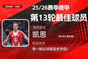 第13輪評選結果結出爐,凱恩替補登場30分鐘上演帽子戲法,助拜仁大勝斯圖加特,獲得吧友超2.7萬票支持,當選【體育資訊X小紅書德甲第13輪最佳球員】!