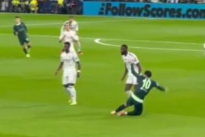 在一次攻防轉(zhuǎn)換回合中,謝爾基拿球先是晃過(guò)了巴爾韋德的鏟搶?zhuān)S后將球分出,然而回防的呂迪格一把將其撞倒在地,謝爾基躺在地上攤手一臉困惑。