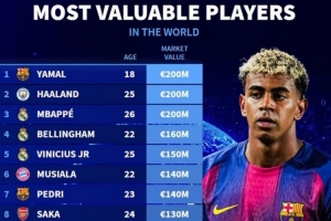體育資訊12月13日訊 德轉(zhuǎn)列當前身價排名前十五的球員,亞馬爾、哈蘭德、姆巴佩2億歐并列第一。