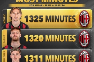 本賽季米蘭球員意甲出場時間榜: