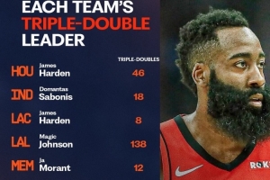 休斯頓火箭隊:詹姆斯·哈登46次;