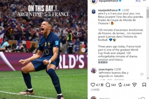 法國隊官方社媒曬出姆巴佩慶祝進球的照片,配文:“3年前的今天,法國隊參加了史上最精彩的世界杯決賽之一。那是120分鐘令人難忘的戲劇性、情感與歷史時刻的交織?!?/p>