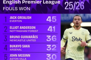 英超造犯規(guī)榜:格拉利什壓安德森居首,薩卡、若昂·佩德羅在列