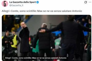 比賽結(jié)束后,阿萊格里徑直走回更衣室,未與孔蒂握手致意??椎賱t留在場上向?qū)κ种乱?,與阿萊格里的長期助手馬爾科·蘭杜奇以及米蘭球員們握了手。