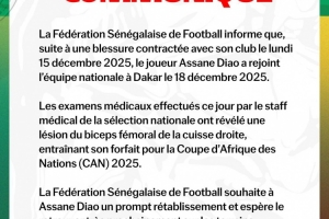 國(guó)家隊(duì)醫(yī)療團(tuán)隊(duì)今日進(jìn)行的檢查顯示,阿薩尼·迪奧右大腿股二頭肌受傷,無法參加本屆非洲杯。