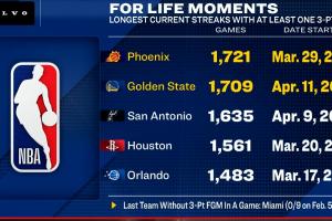 NBA球隊(duì)上一次出現(xiàn)全場沒進(jìn)三分的情況還是在2016年2月6日(當(dāng)?shù)貢r(shí)間2月5日),該場比賽熱火全隊(duì)三分9中0。
