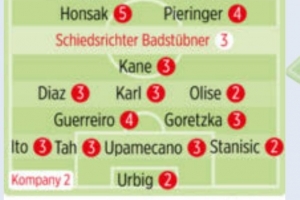 體育資訊12月22日訊 德甲第15輪比賽,拜仁客場(chǎng)4-0擊敗海登海姆,德國媒體《圖片報(bào)》對(duì)球員進(jìn)行評(píng)分,烏爾比希、奧利塞、斯坦尼西奇2分最高。