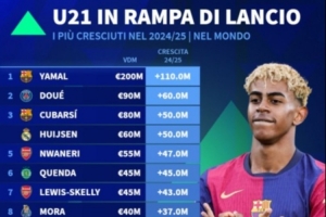 體育資訊6月28日訊 德轉(zhuǎn)列U21球員24-25賽季身價漲幅排行,亞馬爾+1.1億歐居首,杜埃+6000萬歐第二,庫巴西、懷森并列第三。