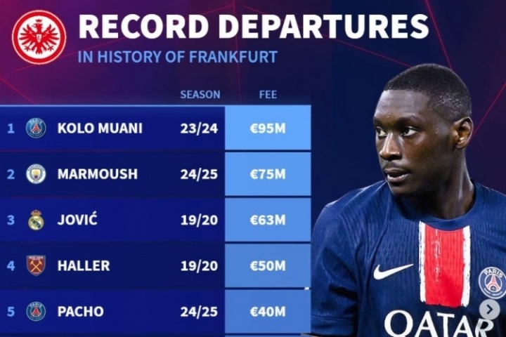 如果這筆轉(zhuǎn)會(huì)按照目前的進(jìn)展順利完成,?;倏擞型蔀榉ㄌm克福隊(duì)史轉(zhuǎn)出標(biāo)王,超越9500萬歐的穆阿尼。