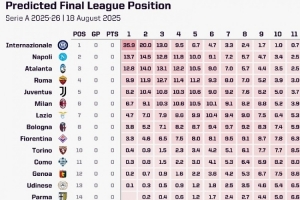 體育資訊8月21日訊 opta通過超級計算機預測本賽季意甲排名,國米有35.9%的概率奪冠,在奪冠概率上那不勒斯、亞特蘭大分列二三位。