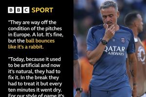 恩里克說(shuō):“這里的球場(chǎng)條件與歐洲的球場(chǎng)差得很遠(yuǎn)。差別很大,雖然還算可以,但球在場(chǎng)地上彈跳得像兔子一樣。