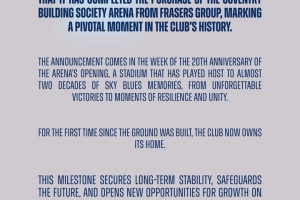 俱樂部公告寫道:“考文垂足球俱樂部欣喜宣布,已完成從弗雷澤集團收購考文垂建筑協(xié)會競技場的交易,這標志著俱樂部歷史上一個決定性時刻?!?/p>