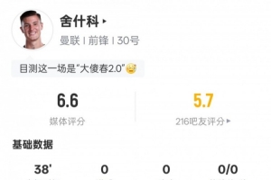 體育資訊8月25日訊 2025-26賽季英超第2輪,曼聯(lián)客場(chǎng)1-1富勒姆。舍什科替補(bǔ)出戰(zhàn),多項(xiàng)數(shù)據(jù)掛零,只有2次爭(zhēng)頂均成功。