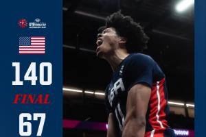 美國(guó)隊(duì)陣中,2027年NBA狀元大熱門泰蘭-斯托克斯表現(xiàn)神勇轟出三雙+7搶斷,他登場(chǎng)24分21秒11投9中,三分1中0、罰球3中1,砍下19分11籃板10助攻7搶斷,正負(fù)值是+44。