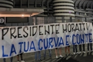國米球迷組織北看臺拉出橫幅,為莫拉蒂送上祝福,上面寫著:“莫拉蒂主席,你的北看臺與你同在?!?/p>
