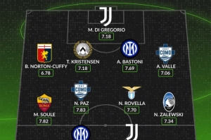 中場:蘇萊(羅馬,7.82分)、帕斯(科莫,7.83分)、羅維拉(拉齊奧,7.70分)、扎萊夫斯基(亞特蘭大,7.34分)