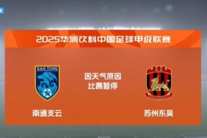 體育資訊9月14日訊 中甲第22輪,南通支云vs蘇州東吳的比賽因雷暴天氣暫停。