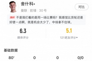體育資訊9月15日訊 英超曼市德比,曼聯(lián)前鋒舍什科首發(fā)出戰(zhàn),球員本場數(shù)據(jù)如下: