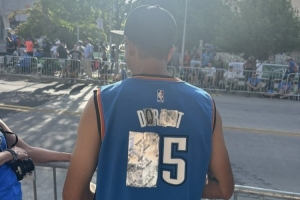在現(xiàn)場,一名球迷身穿“多特”的爆改球衣,可以看出原版應(yīng)該是一件杜蘭特的35號球衣。