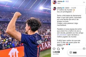 體育資訊9月24日訊 在獲得金球獎(jiǎng)第三名后,巴黎中場(chǎng)維蒂尼亞更新了社交媒體。