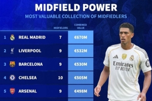 體育資訊9月25日訊 日前,德轉(zhuǎn)統(tǒng)計了各隊中場球員總身價排行,皇馬7名中場總價6.7億歐居首。