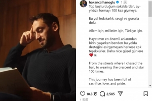 恰爾汗奧盧達(dá)成國家隊(duì)出戰(zhàn)100場里程碑,他在社交媒體上寫道:“從在街頭追逐足球,到身披星月戰(zhàn)袍(土耳其隊(duì)球衣)出戰(zhàn)百場。這段旅程充滿了犧牲、熱愛與驕傲。為我的家人,為我的祖國,為土耳其?!?/p>